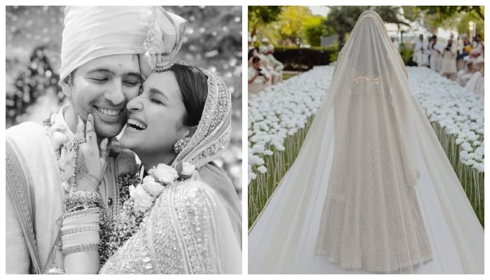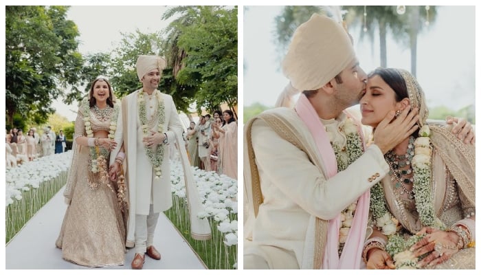 The couple shared enchanting photos of their wedding ceremony on Instagram early Monday morning. Parineeti was a vision in her elegant golden and white bridal attire, while Raghav looked dashing in his white sherwani.